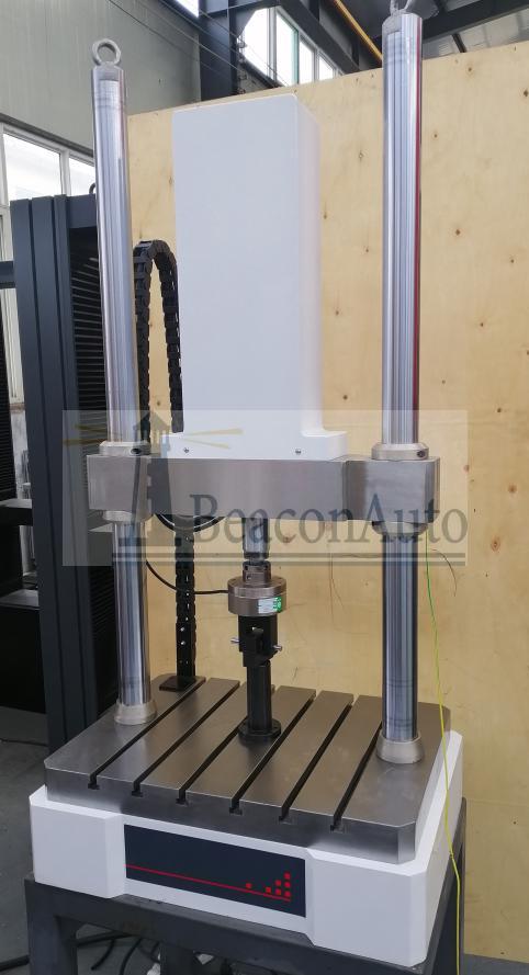 產(chǎn)品型號:PDS-5000L 橡膠襯套拉伸扭轉(zhuǎn)疲勞試驗(yàn)機(jī)是進(jìn)行橡膠襯套疲勞耐久性試驗(yàn)的專用設(shè)備;試驗(yàn)臺主要由擺動加載系統(tǒng)、徑向伺服加載系統(tǒng)、扭矩測量控制系統(tǒng)、角度測量控制系統(tǒng)、負(fù)荷及位移測控系統(tǒng)等部分組成;計(jì)算機(jī)軟件采用C++編寫,具有靈活性和擴(kuò)展性。 產(chǎn)品用途: 橡膠襯套拉伸扭轉(zhuǎn)疲勞試驗(yàn)機(jī) 橡膠襯套動靜鋼度試驗(yàn)機(jī)主要用于橡膠襯套,襯套起襯墊作用的環(huán)套 在閥門應(yīng)用領(lǐng)域,襯套在閥蓋之內(nèi),一般使用聚四氟乙烯或者石墨等耐腐材料,用于密封作用。裹住閥桿,磨損了,可以方便更換。具有靈活性和擴(kuò)展性,廣泛應(yīng)用于焊接點(diǎn)、彈簧鋼、管類、棒材、輪軸類等金屬和非金屬制品進(jìn)行扭轉(zhuǎn)測試,能獲得*扭矩、抗扭強(qiáng)度、上屈服強(qiáng)度和下屈服強(qiáng)度等性能參數(shù);并可以打印詳細(xì)的數(shù)據(jù)報(bào)告。 依據(jù)標(biāo)準(zhǔn): 1.GB/T 10128-1998 《金屬室溫扭轉(zhuǎn)試驗(yàn)方法》 2.GB/T 10128-2007 《金屬室溫扭轉(zhuǎn)試驗(yàn)方法》 技術(shù)指標(biāo): 1、徑向負(fù)荷加載力: 0--120Kn; 2、徑向力值測量精度: ±1% FS; 3、伺服油缸行程: 0-100mm; 4、徑向位移測量精度: ±1% FS; 5、靜態(tài)測量扭矩: ±2000Nm(靜態(tài)); 6、擺動加載頻率: 0.1-10Hz; 7、擺動角度: ±45°; 8、扭矩測量精度: ±1% FS (靜態(tài)); 9、擺動工作頻率: 0.1-10Hz; 10、擺角分辨率: ±0.05° (靜態(tài)); 11、擺角精度: ±1%F.S (靜態(tài))。 12、加載波形: 正弦波、三角波等 13、擺動控制方式: 扭矩、轉(zhuǎn)角 14、徑向加載控制方式: 負(fù)荷、位移 產(chǎn)品特點(diǎn): 1、適用于WINDOWS平臺的中文試驗(yàn)軟件,實(shí)現(xiàn)試驗(yàn)數(shù)據(jù)采集處理。 2、可實(shí)時采集試驗(yàn)數(shù)據(jù)、運(yùn)算處理、實(shí)時顯示并打印結(jié)果報(bào)告。 3、曲線遍歷:可用鼠標(biāo)對曲線數(shù)據(jù)逐點(diǎn)訪問,以便求取各種數(shù)據(jù)。扭矩與扭角關(guān)系曲線中能反映任意點(diǎn)扭矩—角度的關(guān)系,能方便地在曲線上找到所求數(shù)據(jù)點(diǎn);可方便地對曲線局部放大還原等。 4、根據(jù)需要可隨時對扭矩、角度測量通道進(jìn)行手動或自動清零。 5、自動存盤:試驗(yàn)條件、試驗(yàn)數(shù)據(jù)自動存盤,需要時可隨時調(diào)出。 6、批量試驗(yàn):試驗(yàn)條件設(shè)定后,可依次完成一批樣品的試驗(yàn),試驗(yàn)條件、試樣參數(shù)、測試數(shù)據(jù)、結(jié)果可存儲,隨時調(diào)用,再次試驗(yàn)無須設(shè)置。 7、打印試驗(yàn)報(bào)表。 工作原理: 主機(jī)徑向加載機(jī)構(gòu)采用雙立柱結(jié)構(gòu),臺面板和橫梁用厚鋼板制造,立柱采用鍍鉻圓柱,保證了整機(jī)加載時的剛度;位移傳感器同軸安裝在伺服油缸內(nèi)部,保證了測量的準(zhǔn)確性;采用伺服閥閉環(huán)控制油缸動作,保證加載力和位移控制的準(zhǔn)確;伺服擺動系統(tǒng)使用擺動作動器加載方式運(yùn)動,同軸安裝角度傳感器測量實(shí)時旋轉(zhuǎn)角度,并通過伺服控制器執(zhí)行控制;滑臺系統(tǒng)主要是為了安裝試樣方便,同時可滿足各種不同規(guī)格的試樣安裝位置要求;夾具系統(tǒng)采用同軸棒與試樣內(nèi)孔連接,并用螺母固定,試樣外圈與夾具體固定連接,徑向加載軸及旋轉(zhuǎn)軸均與同軸棒連接,通過同軸棒對內(nèi)圈加載及施加扭矩。 液壓源油泵機(jī)組采用三相異步電機(jī)加齒輪泵構(gòu)成,系統(tǒng)壓力通過溢流閥設(shè)定,輸出到系統(tǒng)的壓力油經(jīng)過了小于6μm過濾精度的過濾器的過濾,保證伺服閥安全可靠的進(jìn)行工作。回油過濾器對回到油箱的液壓油進(jìn)行過濾,保證油箱中液壓油的清潔。 產(chǎn)品構(gòu)成: 橡膠襯套拉伸扭轉(zhuǎn)疲勞試驗(yàn)機(jī) 橡膠襯套動靜鋼度試驗(yàn)機(jī)分為徑向加載和伺服擺動加載兩個通道,其中徑向加載通道由固定橫梁和立柱組成,位于工作臺面之上,液壓缸和伺服閥裝于橫梁之上。負(fù)荷傳感器與油缸活塞桿相對固定,位移傳感器為磁滯伸縮式,傳感器主體固定在液壓缸底部,磁環(huán)固定在液壓活塞上,隨液壓缸運(yùn)動產(chǎn)生磁信號變化從而測量位移信號。 伺服擺動通道是由一套旋轉(zhuǎn)擺動缸和角度傳感器組成位于工作臺左側(cè),擺動作動器是試驗(yàn)臺的關(guān)鍵器件,主要由擺動缸、角傳感器、伺服閥、蓄能器等組成。擺動液壓缸采用我公司自主研發(fā)生產(chǎn)產(chǎn)品,該作動器采用雙葉片,前法蘭安裝方式;該產(chǎn)品具有低摩擦、低阻尼、高頻響及良好的抗側(cè)向力能力;使用溫度范圍廣、承載能力高、在低速下無爬行現(xiàn)象。角度傳感器和擺動缸活塞桿同軸安裝,選用長春一光產(chǎn)品,角度測量是絕對式測量,測量精度高,環(huán)境適應(yīng)性好。 扭矩傳感器測量系統(tǒng)位于臺面右側(cè),襯套工裝位于臺面之上連接傳感器和擺動缸之間,襯套通過支架與扭矩傳感器法蘭連接,從而測量試件扭轉(zhuǎn)時內(nèi)套和外套的相對角度。扭矩加載由擺動缸通過計(jì)算機(jī)程序控制來實(shí)現(xiàn),扭矩加載通道安裝在移動滑臺上,可根據(jù)工件大小,可做前后移動,便于裝夾試