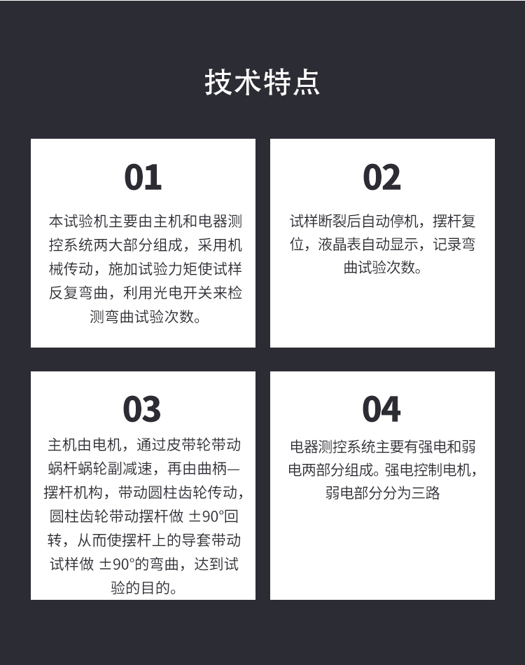 本試驗(yàn)機(jī)主要由主機(jī)和電器測控系統(tǒng)兩大部分組成,采用機(jī)械傳動(dòng),施加試驗(yàn)力矩使試樣反復(fù)彎曲,利用光電開關(guān)來檢測彎曲試驗(yàn)次數(shù)。試樣斷裂后自動(dòng)停機(jī),擺桿復(fù)位,液晶表自動(dòng)顯示,記錄彎曲試驗(yàn)次數(shù)。