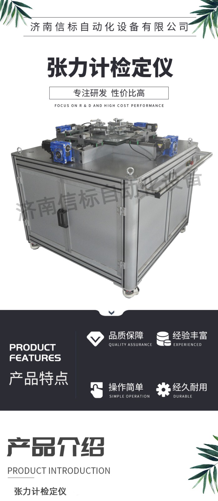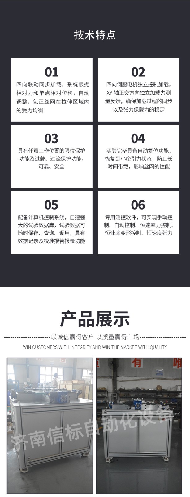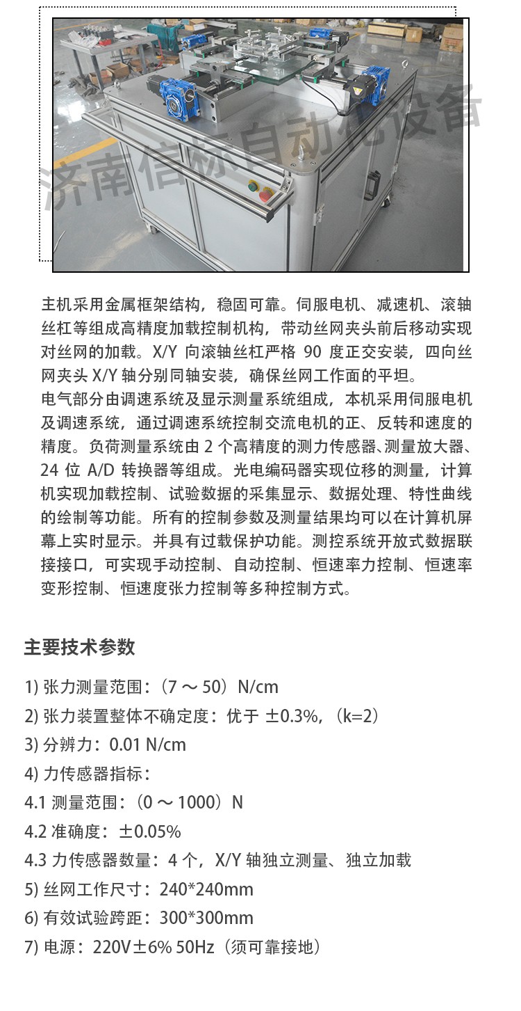 主要功能及技術(shù)指標(biāo): 1.主要技術(shù)指標(biāo) 1) 張力測量范圍:(7~50)N/cm 2) 張力裝置整體不確定度:優(yōu)于±0.3%,(k=2) 3) 分辨力:0.01 N/cm 4) 力傳感器指標(biāo): 4.1測量范圍:(0~1000)N 4.2 準(zhǔn)確度:±0.05% 4.3力傳感器數(shù)量:4個,X/Y軸獨立測量、獨立加載 5) 絲網(wǎng)工作尺寸:240*240mm 6) 有效試驗跨距:300*300mm 7) 電源:220V±6% 50Hz(須可靠接地) 2.主要功能: 1) 四向聯(lián)動同步加載,系統(tǒng)根據(jù)相對力和單點相對位移,自動調(diào)整,包正絲網(wǎng)在拉伸區(qū)域內(nèi)的受力均衡,較老式機械加載有本質(zhì)區(qū)別,軟件內(nèi)部增加縱橫纖維相對力補償算法),保證對絲網(wǎng)加載過程的四個方向受力均勻。 2) 四向伺服電機獨立控制加載,XY軸正交方向獨立加載力測量反饋,確保加載過程的同步以及張力保載力的穩(wěn)定。 3) 具有任意工作位置的限位保護功能及過載、過流保護功能,可靠、安全。 4) 實驗完畢具備自動復(fù)位功能,恢復(fù)到小牽引力狀態(tài),防止長時間帶載,影響絲網(wǎng)的性能。 5) 配備計算機控制系統(tǒng),自建強大的試驗數(shù)據(jù)庫,試驗數(shù)據(jù)可隨時保存、查詢、調(diào)用,具有數(shù)據(jù)記錄及校準(zhǔn)報告報表功能。 6) 專用測控軟件,可實現(xiàn)手動控制、自動控制、恒速率力控制、恒速率變形控制、恒速度張力控制等多種控制方式。 軟件界面圖 7) 采用240mm絲網(wǎng),工作面更加穩(wěn)定,適用更多不同的張力計測量。絲網(wǎng)符合GB/T 5330《工業(yè)用金屬絲編織方孔篩網(wǎng)》或GB/T 14014《合成纖維篩網(wǎng)》標(biāo)準(zhǔn)要求,絲網(wǎng)目數(shù)大于20目/厘米