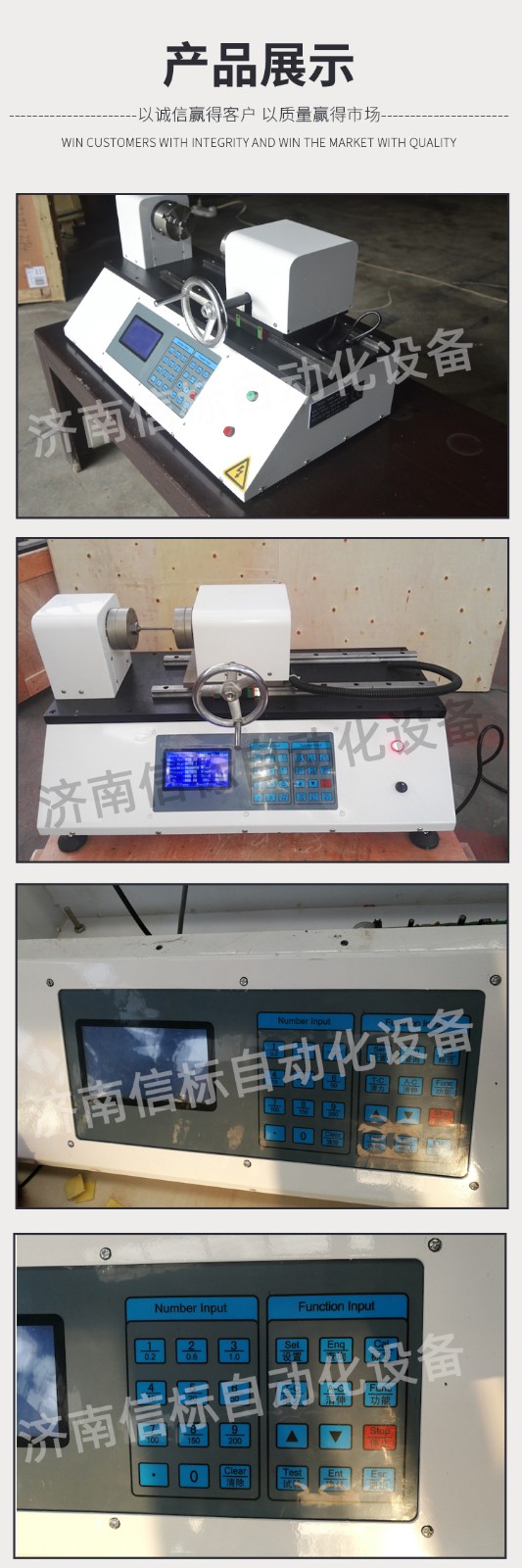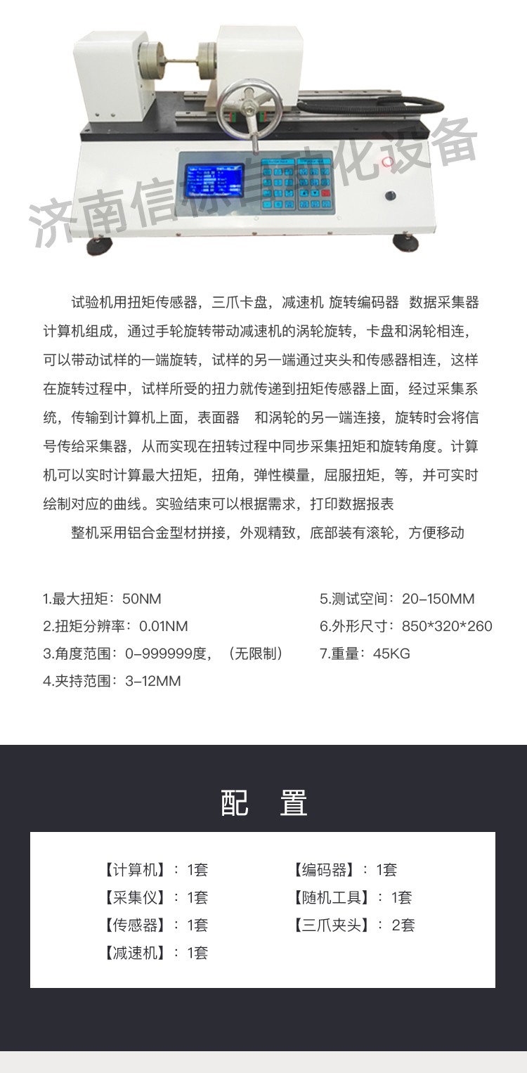 試驗機用扭矩傳感器,三爪卡盤,減速機 旋轉(zhuǎn)編碼器  數(shù)據(jù)采集器 計算機組成,通過手輪旋轉(zhuǎn)帶動減速機的渦輪旋轉(zhuǎn),卡盤和渦輪相連,可以帶動試樣的一端旋轉(zhuǎn),試樣的另一端通過夾頭和傳感器相連,這樣在旋轉(zhuǎn)過程中,試樣所受的扭力就傳遞到扭矩傳感器上面,經(jīng)過采集系統(tǒng),傳輸?shù)接嬎銠C上面,表面器 和渦輪的另一端連接,旋轉(zhuǎn)時會將信號傳給采集器,從而實現(xiàn)在扭轉(zhuǎn)過程中同步采集扭矩和旋轉(zhuǎn)角度。計算機可以實時計算最大扭矩,扭角,彈性模量,屈服扭矩等,并可實時繪制對應的曲線。實驗結(jié)束可以根據(jù)需求,打印數(shù)據(jù)報表,整機采用鋁合金型材拼接,外觀精致,底部裝有滾輪,方便移動。試驗機用扭矩傳感器,三爪卡盤,減速機 旋轉(zhuǎn)編碼器  數(shù)據(jù)采集器 計算機組成,通過手輪旋轉(zhuǎn)帶動減速機的渦輪旋轉(zhuǎn),卡盤和渦輪相連,可以帶動試樣的一端旋轉(zhuǎn),試樣的另一端通過夾頭和傳感器相連,這樣在旋轉(zhuǎn)過程中,試樣所受的扭力就傳遞到扭矩傳感器上面,經(jīng)過采集系統(tǒng)。