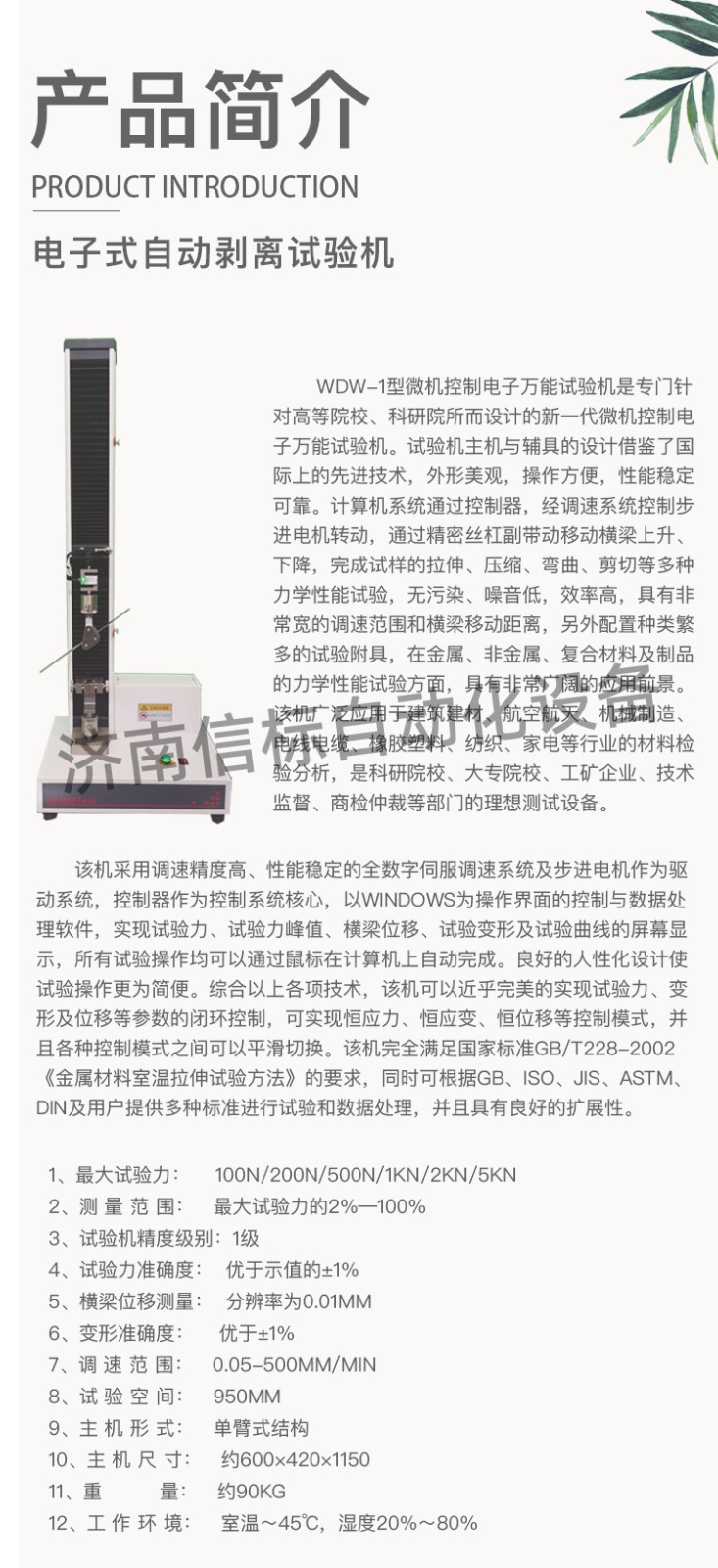 高強(qiáng)度膠黏劑膠帶浮棍法90度180度剝離強(qiáng)度試驗機(jī)主要技術(shù)指標(biāo): 1、最大試驗力:    100N/200N/500N/1KN/2KN/5KN 2、測 量 范 圍:   最大試驗力的2%—100% 3、試驗機(jī)精度級別:1級 4、試驗力準(zhǔn)確度:  優(yōu)于示值的±1% 5、橫梁位移測量:  分辨率為0.01mm 6、變形準(zhǔn)確度:    優(yōu)于±1% 7、調(diào) 速 范 圍:   0.05-500mm/min 8、試 驗 空 間:   950mm 9、主 機(jī) 形 式:   單臂式結(jié)構(gòu) 10、主 機(jī) 尺 寸:   約600×420×1150 11、重       量:   約90Kg 12、工 作 環(huán) 境:   室溫~45℃,濕度20%~80%
