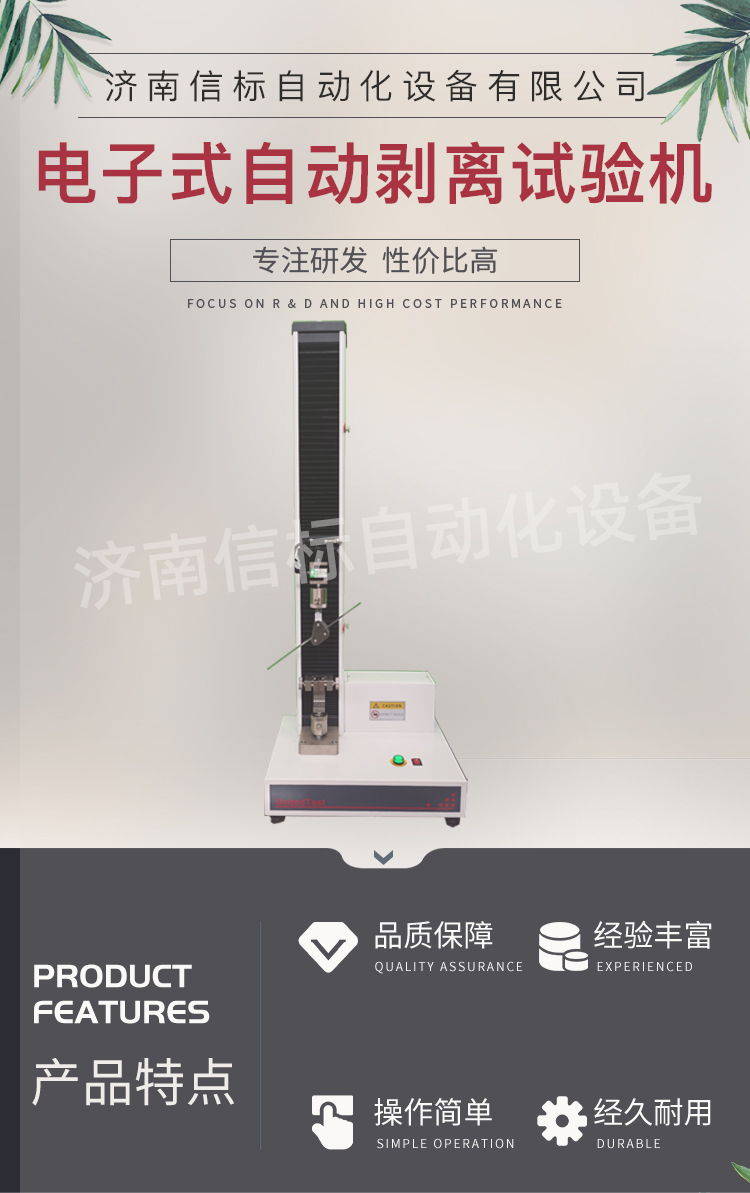 高強(qiáng)度膠黏劑膠帶浮棍法90度180度剝離強(qiáng)度試驗機(jī)主要功能及特點: 1、主機(jī): 1.1調(diào)速系統(tǒng)采用伺服電機(jī)和自主研發(fā)減速系統(tǒng),性能穩(wěn)定可靠,具有過流、過壓、過載等保護(hù)裝置。調(diào)速范圍可達(dá)0.05~500mm/min。 1.2傳動部分采用圓弧同步齒形帶,精密絲杠副傳動,傳動平穩(wěn),噪音低,傳動效率高。 1.3萬向節(jié)采用十字插銷結(jié)構(gòu),而且具有擺角限制功能,一方面便于試樣夾持,保證試驗同心度,另一方面很好的消除了不規(guī)則試樣對傳感器的影響。 2、控制系統(tǒng)、操作軟件及數(shù)據(jù)處理系統(tǒng) 2.1計算機(jī)控制系統(tǒng),具有集成度高、性能穩(wěn)定、調(diào)整方便等優(yōu)點??梢詫嶒灁?shù)據(jù)進(jìn)行實時采集,對實驗特性曲線實現(xiàn)實時動態(tài)顯示,試驗數(shù)據(jù)文件能以Access常用數(shù)據(jù)庫或SQLserve大型數(shù)據(jù)庫的方式保存,方便實現(xiàn)客戶的資源共享及網(wǎng)絡(luò)管理,以及用戶的再分析。對于用戶自定義的各種word2000報表,該軟件可輕松實現(xiàn)訪問,解決了不同用戶或同一用戶在不同時期對試驗報表有不同需要的難題。該軟件可處理試驗力、位移、時間、變形的原始數(shù)據(jù)及由此派生的曲線。