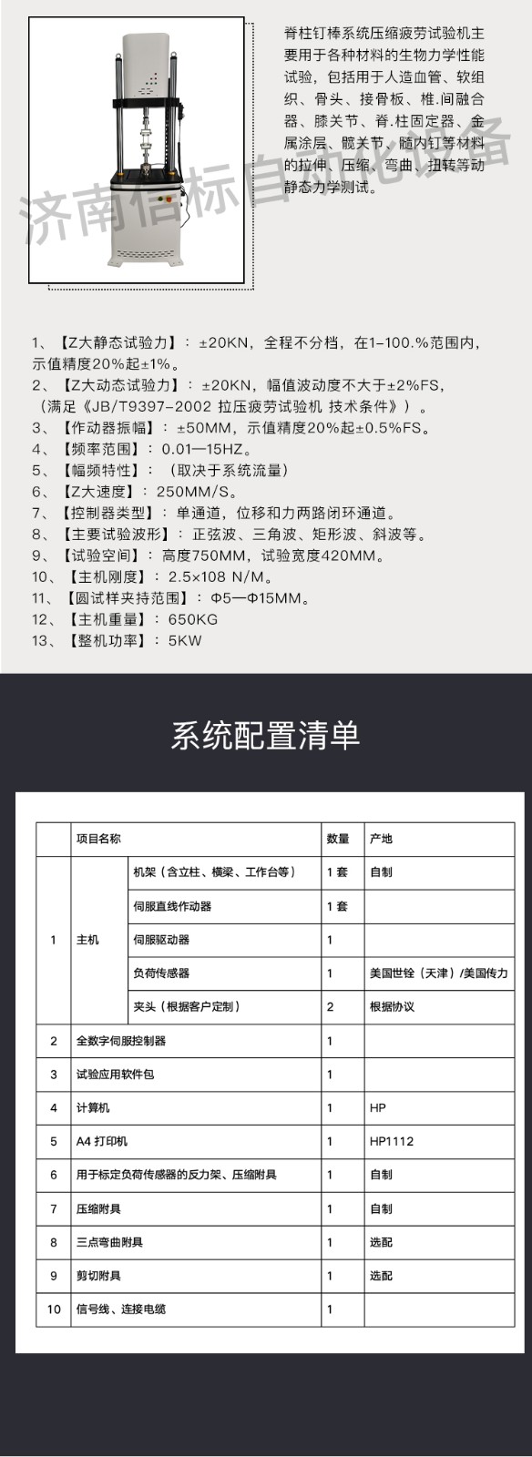 濟(jì)南信標(biāo)自動化設(shè)備有限公司主要生產(chǎn):動靜態(tài)萬能疲勞試驗(yàn)機(jī),接骨板彎曲試驗(yàn)機(jī),縫合線拉伸疲勞試驗(yàn)機(jī),髖膝關(guān)節(jié)磨損試驗(yàn)機(jī),電子萬能試驗(yàn)機(jī)、液壓萬能試驗(yàn)機(jī)、巖石三軸、四軸,電液拉力試驗(yàn)機(jī),材料試驗(yàn)機(jī),高低溫蠕變,高低頻疲勞,拉伸、扭轉(zhuǎn)、杯突等二十多個系列兩千多個的品種。