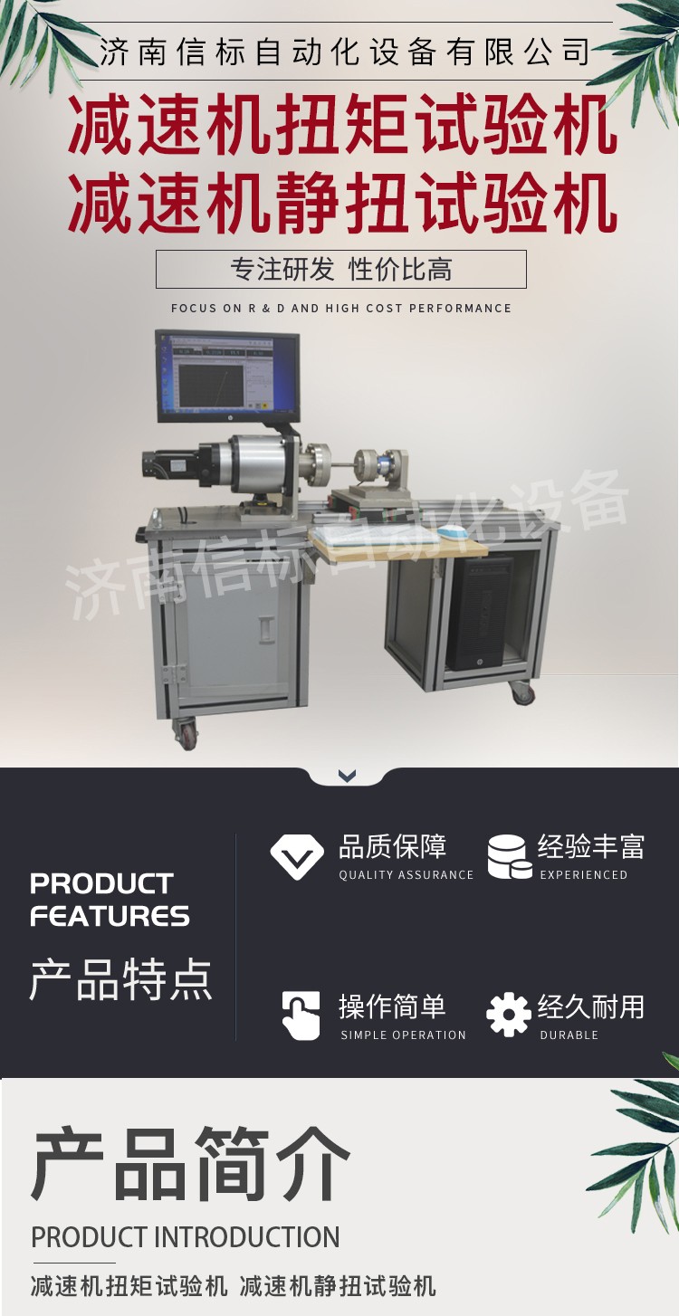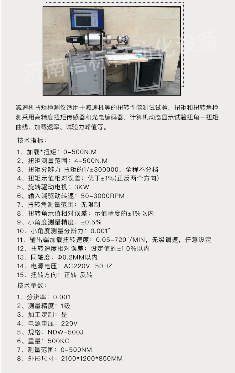 減速機(jī)扭矩試驗機(jī) 減速機(jī)靜扭試驗機(jī)產(chǎn)品特點: 1、主機(jī):采用臥式結(jié)構(gòu),主體結(jié)構(gòu)采用框架結(jié)構(gòu),以保證整機(jī)的剛性。主傳動軸、夾具采用 鋼材,保證其使用壽命。試樣的安裝、拆卸方便、快捷。夾頭的移動端采用精密重型導(dǎo)軌,使其能自由移動,將試件的軸向拉力減少到 小。 2、驅(qū)動系統(tǒng):由進(jìn)口全數(shù)字交流伺服控制系統(tǒng)驅(qū)動,速度調(diào)節(jié)范圍寬,加載均勻、穩(wěn)定。 3、傳動系統(tǒng):采用精密減速器傳動,保證傳動的均勻、穩(wěn)定及傳動精度。橫向空間0~600mm范圍內(nèi)任意手動調(diào)節(jié)。 4、測量顯示系統(tǒng):該機(jī)采用光電編碼器采集試樣的扭轉(zhuǎn)角度,高精度扭矩傳感器采集試樣的扭矩,高精度旋轉(zhuǎn)編碼器測量試樣的扭轉(zhuǎn)變形。計算機(jī)屏幕顯示試樣的扭矩、扭轉(zhuǎn)角度、扭轉(zhuǎn)變形以及各類曲線等。 技術(shù)指標(biāo): 1.  加載*扭矩:0-500N.m 2.  扭矩測量范圍:4-500N.m 3.  扭矩分辨力 扭矩的1/±300000,全程不分檔 4.  扭矩示值相對誤差:優(yōu)于±1%(正反兩個方向) 5.  旋轉(zhuǎn)驅(qū)動電機(jī):3kW 6.  輸入端驅(qū)動轉(zhuǎn)速:50-3000rpm 7.  扭轉(zhuǎn)角測量范圍:無限制 8.  扭轉(zhuǎn)角示值相對誤差:示值精度的±1%以內(nèi) 9.  小角度測量精度:±0.5% 10.小角度測量分辨力:0.001° 11.輸出端加載扭轉(zhuǎn)速度:0.05-720°/min,無級調(diào)速,任意設(shè)定 12.扭轉(zhuǎn)速度相對誤差:設(shè)定值的±1.0%以內(nèi) 13.同軸度:Ф0.2mm以內(nèi) 14.電源電壓:AC220V  50Hz 15.扭轉(zhuǎn)方向:正轉(zhuǎn) 反轉(zhuǎn) 技術(shù)參數(shù): 1分辨率:0.001 2測量精度:1級 3加工定制:是 4電源電壓:220v 5規(guī)格:NDW-500J 6重量:500kg 7測量范圍:0-500nm 8外形尺寸:2100*1200*850mm