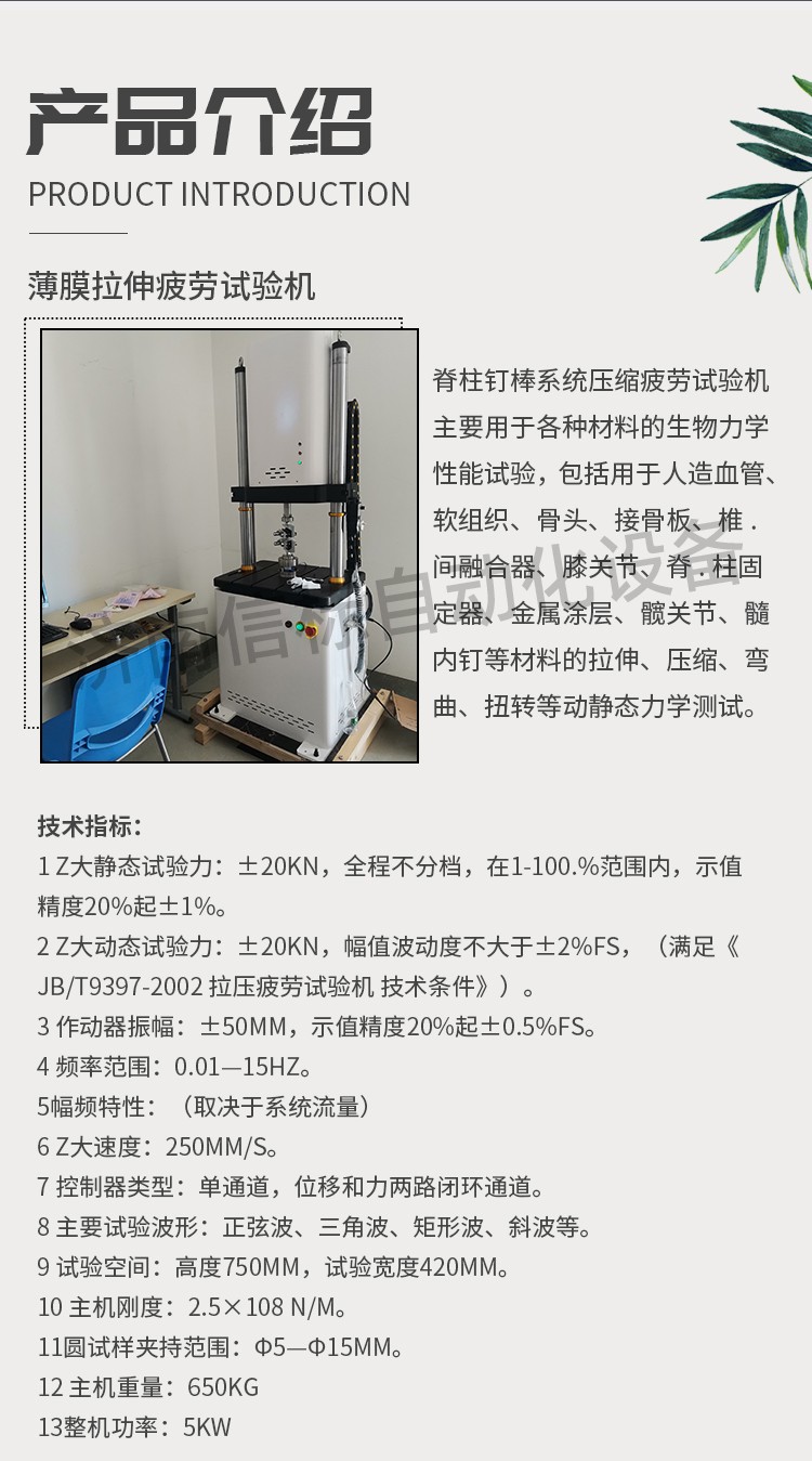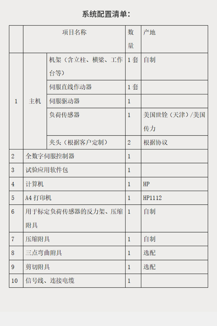 技術(shù)指標(biāo): 3.1 Z大靜態(tài)試驗(yàn)力:±20kN,全程不分檔,在1-100.%范圍內(nèi),示值精度20%起±1%。 3.2 Z大動(dòng)態(tài)試驗(yàn)力:±20kN,幅值波動(dòng)度不大于±2%FS,(滿足《JB/T9397-2002 拉壓疲勞試驗(yàn)機(jī) 技術(shù)條件》)。 3.3 作動(dòng)器振幅:±50mm,示值精度20%起±0.5%FS。 3.4 頻率范圍:0.01—15Hz。 3.5幅頻特性:(取決于系統(tǒng)流量) 3.6 Z大速度:250mm/s。 3.7 控制器類型:?jiǎn)瓮ǖ溃灰坪土陕烽]環(huán)通道。 3.8 主要試驗(yàn)波形:正弦波、三角波、矩形波、斜波等。 3.9 試驗(yàn)空間:高度750mm,試驗(yàn)寬度420mm。 3.10 主機(jī)剛度:2.5×108 N/m。 3.11圓試樣夾持范圍:φ5—φ15mm。 3.12 主機(jī)重量:650kg 3.13整機(jī)功率:5kw 系統(tǒng)配置清單: 	項(xiàng)目名稱	數(shù)量	產(chǎn)地 1	主機(jī)	機(jī)架(含立柱、橫梁、工作臺(tái)等)	1套	自制 		伺服直線作動(dòng)器	1套	 		伺服驅(qū)動(dòng)器	1	 		負(fù)荷傳感器	1	美國(guó)世銓(天津)/美國(guó)傳力 		夾頭(根據(jù)客戶定制)	2	根據(jù)協(xié)議 2	全數(shù)字伺服控制器	1	 3	試驗(yàn)應(yīng)用軟件包	1	 4	計(jì)算機(jī)	1	HP 5	A4打印機(jī)	1	HP1112 6	用于標(biāo)定負(fù)荷傳感器的反力架、壓縮附具	1	自制 7	壓縮附具	1	自制 8	三點(diǎn)彎曲附具	1	選配 9	剪切附具	1	選配 10	信號(hào)線、連接電纜	1