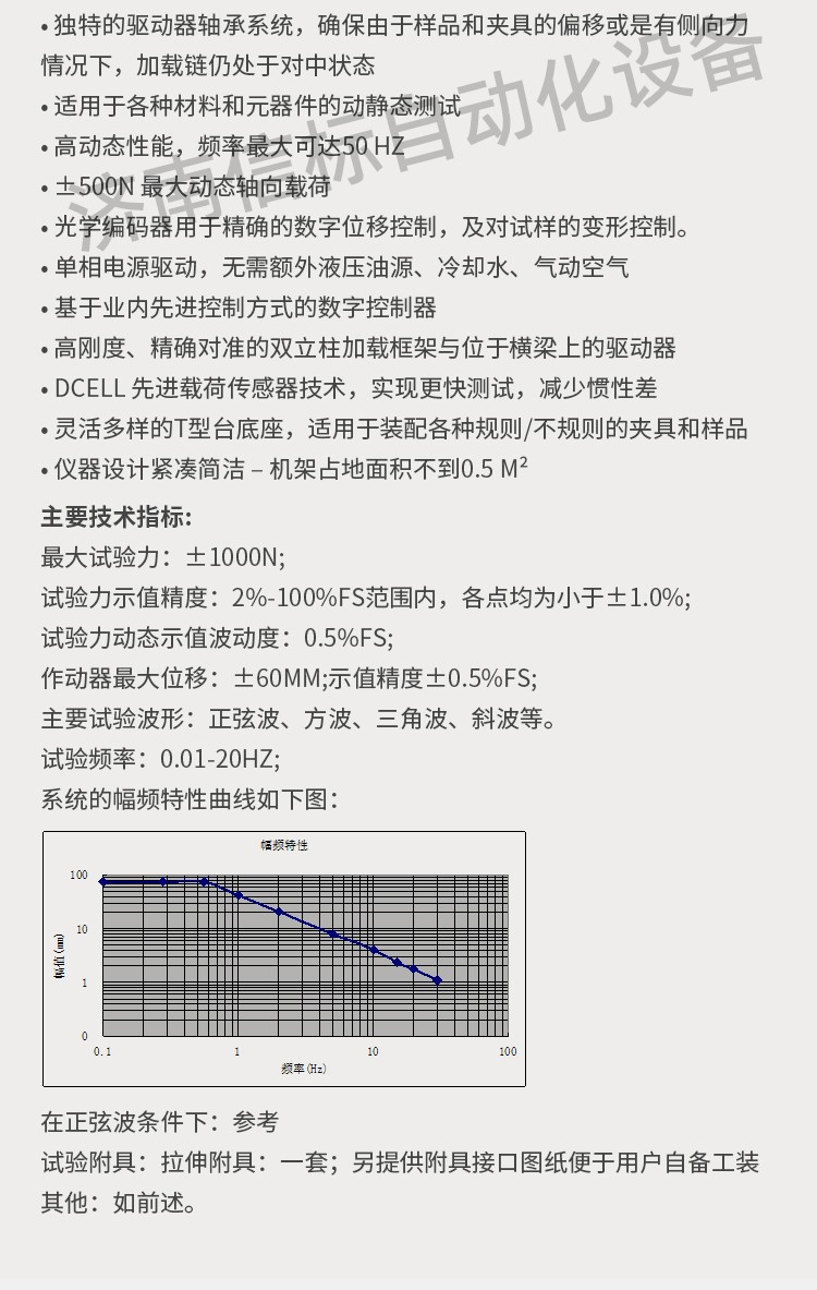 優(yōu)勢(shì)特點(diǎn): ?無(wú)需油源的直線電機(jī)技術(shù),保證潔凈的測(cè)試環(huán)境 ? 軸向通道采用Can總線式控制方式 ? 高速直線作動(dòng)器 ? 獨(dú)特的驅(qū)動(dòng)器軸承系統(tǒng),確保由于樣品和夾具的偏移或是有側(cè)向力情況下,加載鏈仍處于對(duì)中狀態(tài) ? 適用于各種材料和元器件的動(dòng)靜態(tài)測(cè)試 ? 高動(dòng)態(tài)性能,頻率最大可達(dá)50 Hz ? ±500N 最大動(dòng)態(tài)軸向載荷 ? 光學(xué)編碼器用于精確的數(shù)字位移控制,及對(duì)試樣的變形控制。 ? 單相電源驅(qū)動(dòng),無(wú)需額外液壓油源、冷卻水、氣動(dòng)空氣 ? 基于業(yè)內(nèi)先進(jìn)控制方式的數(shù)字控制器 ? 高剛度、精確對(duì)準(zhǔn)的雙立柱加載框架與位于橫梁上的驅(qū)動(dòng)器 ? Dcell 先進(jìn)載荷傳感器技術(shù),實(shí)現(xiàn)更快測(cè)試,減少慣性差 ? 靈活多樣的T型臺(tái)底座,適用于裝配各種規(guī)則/不規(guī)則的夾具和樣品 ? 儀器設(shè)計(jì)緊湊簡(jiǎn)潔 – 機(jī)架占地面積不到0.5 m2   優(yōu)勢(shì)特點(diǎn): ?無(wú)需油源的直線電機(jī)技術(shù),保證潔凈的測(cè)試環(huán)境 ? 軸向通道采用Can總線式控制方式 ? 高速直線作動(dòng)器 ? 獨(dú)特的驅(qū)動(dòng)器軸承系統(tǒng),確保由于樣品和夾具的偏移或是有側(cè)向力情況下,加載鏈仍處于對(duì)中狀態(tài) ? 適用于各種材料和元器件的動(dòng)靜態(tài)測(cè)試 ? 高動(dòng)態(tài)性能,頻率最大可達(dá)50 Hz ? ±500N 最大動(dòng)態(tài)軸向載荷 ? 光學(xué)編碼器用于精確的數(shù)字位移控制,及對(duì)試樣的變形控制。 ? 單相電源驅(qū)動(dòng),無(wú)需額外液壓油源、冷卻水、氣動(dòng)空氣 ? 基于業(yè)內(nèi)先進(jìn)控制方式的數(shù)字控制器 ? 高剛度、精確對(duì)準(zhǔn)的雙立柱加載框架與位于橫梁上的驅(qū)動(dòng)器 ? Dcell 先進(jìn)載荷傳感器技術(shù),實(shí)現(xiàn)更快測(cè)試,減少慣性差 ? 靈活多樣的T型臺(tái)底座,適用于裝配各種規(guī)則/不規(guī)則的夾具和樣品 ? 儀器設(shè)計(jì)緊湊簡(jiǎn)潔 – 機(jī)架占地面積不到0.5 m2