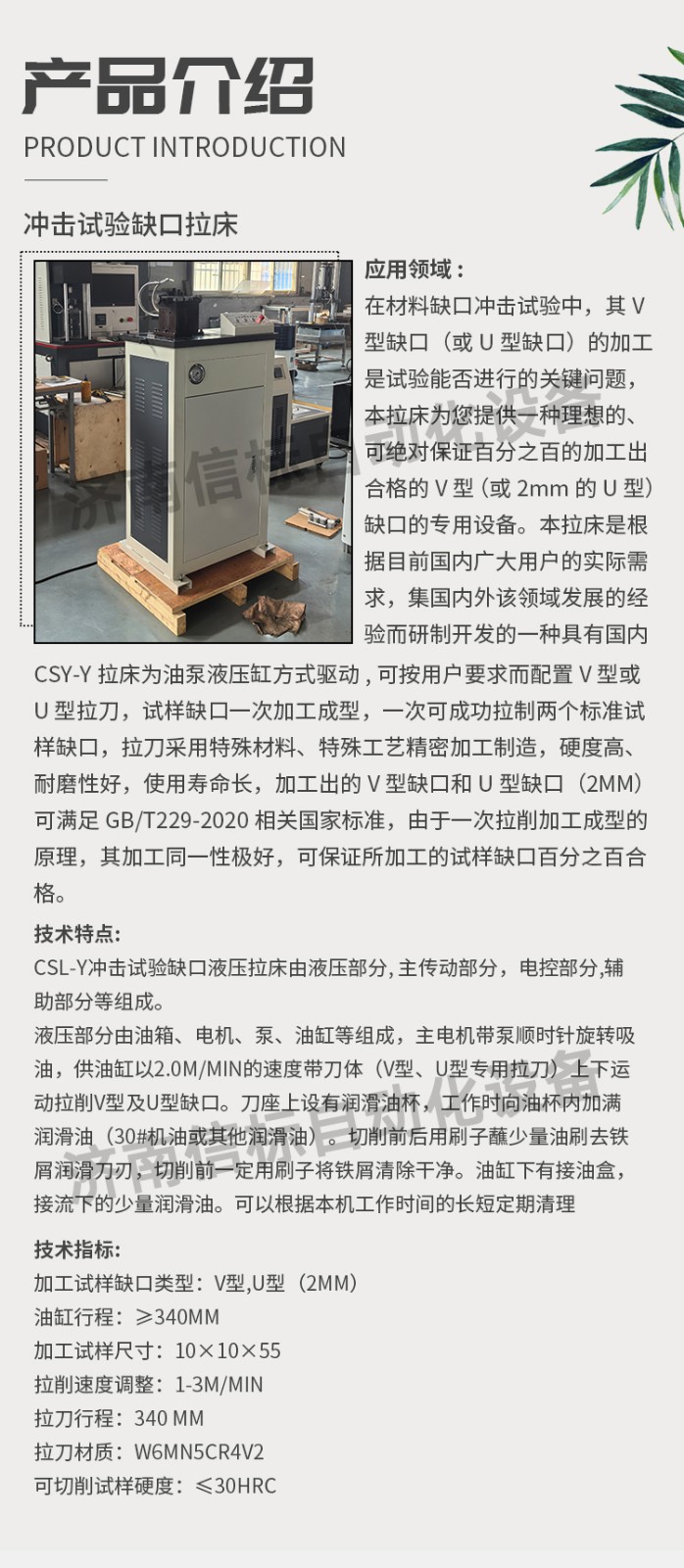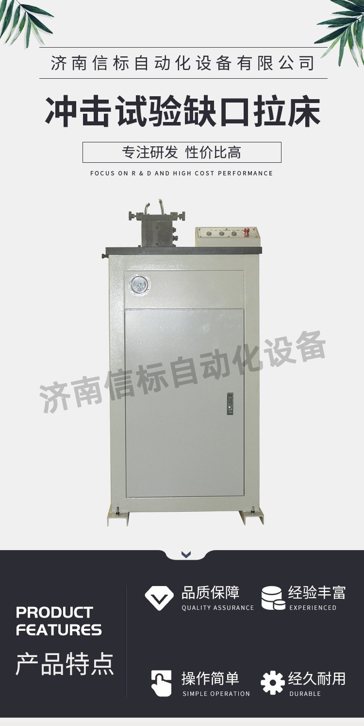 CSY-Y拉床為油泵液壓缸方式驅(qū)動,可按用戶要求而配置V 型或U 型拉刀,試樣缺口一次加工成型,一次可成功拉制兩個標(biāo)準(zhǔn)試樣缺口,拉刀采用特殊材料、特殊工藝精密加工制造,硬度高、耐磨性好,使用壽命長,加工出的V 型缺口和U 型缺口(2mm)可滿足GB/T229-2020相關(guān)國家標(biāo)準(zhǔn),由于一次拉削加工成型的原理,其加工同一性極好,可保證所加工的試樣缺口百分之百合格。 三、技術(shù)特點: CSL-Y沖擊試驗缺口液壓拉床由液壓部分, 主傳動部分,電控部分,輔助部分等組成。 液壓部分由油箱、電機、泵、油缸等組成,主電機帶泵順時針旋轉(zhuǎn)吸油,供油缸以2.0m/min的速度帶刀體(V型、U型專用拉刀)上下運動拉削V型及U型缺口。刀座上設(shè)有潤滑油杯,工作時向油杯內(nèi)加滿潤滑油(30#機油或其他潤滑油)。切削前后用刷子蘸少量油刷去鐵屑潤滑刀刃,切削前一定用刷子將鐵屑清除干凈。油缸下有接油盒,接流下的少量潤滑油??梢愿鶕?jù)本機工作時間的長短定期清理 四、技術(shù)指標(biāo): 加工試樣缺口類型:V型,U型(2mm) 油缸行程:≥340mm 加工試樣尺寸:10×10×55 拉削速度調(diào)整:1-3m/min 拉刀行程:340 mm 拉刀材質(zhì):W6Mn5Cr4V2 可切削試樣硬度:≤30HRC 五、設(shè)備配置: 缺口自動拉床主機                 1臺 拉刀及導(dǎo)向裝置                   1套 試樣固定裝置                     2套 油缸及連接部件                   1套 潤滑噴淋系統(tǒng)                     1套 10MPa油源動力系統(tǒng)              1套 電氣及控制系統(tǒng)                   1套 防護系統(tǒng)(帶開門斷電)           1套 產(chǎn)品合格證                       1套 產(chǎn)品使用說明書                   1套 產(chǎn)品使用說明書                   1套 液壓系統(tǒng)配件                     1套