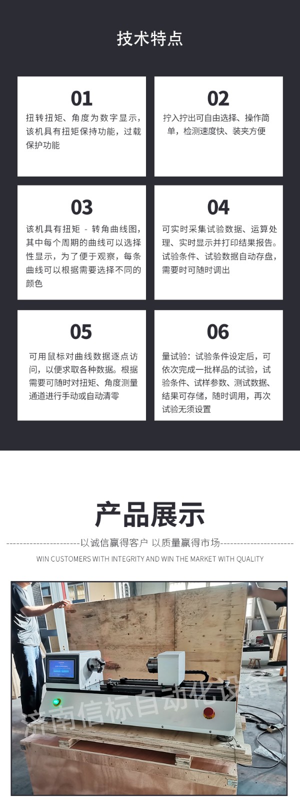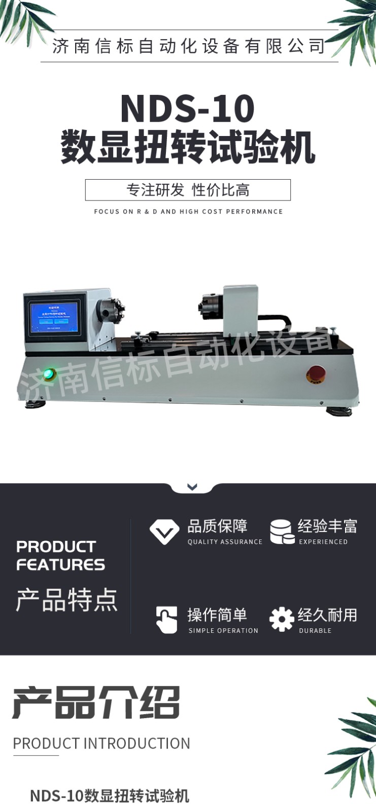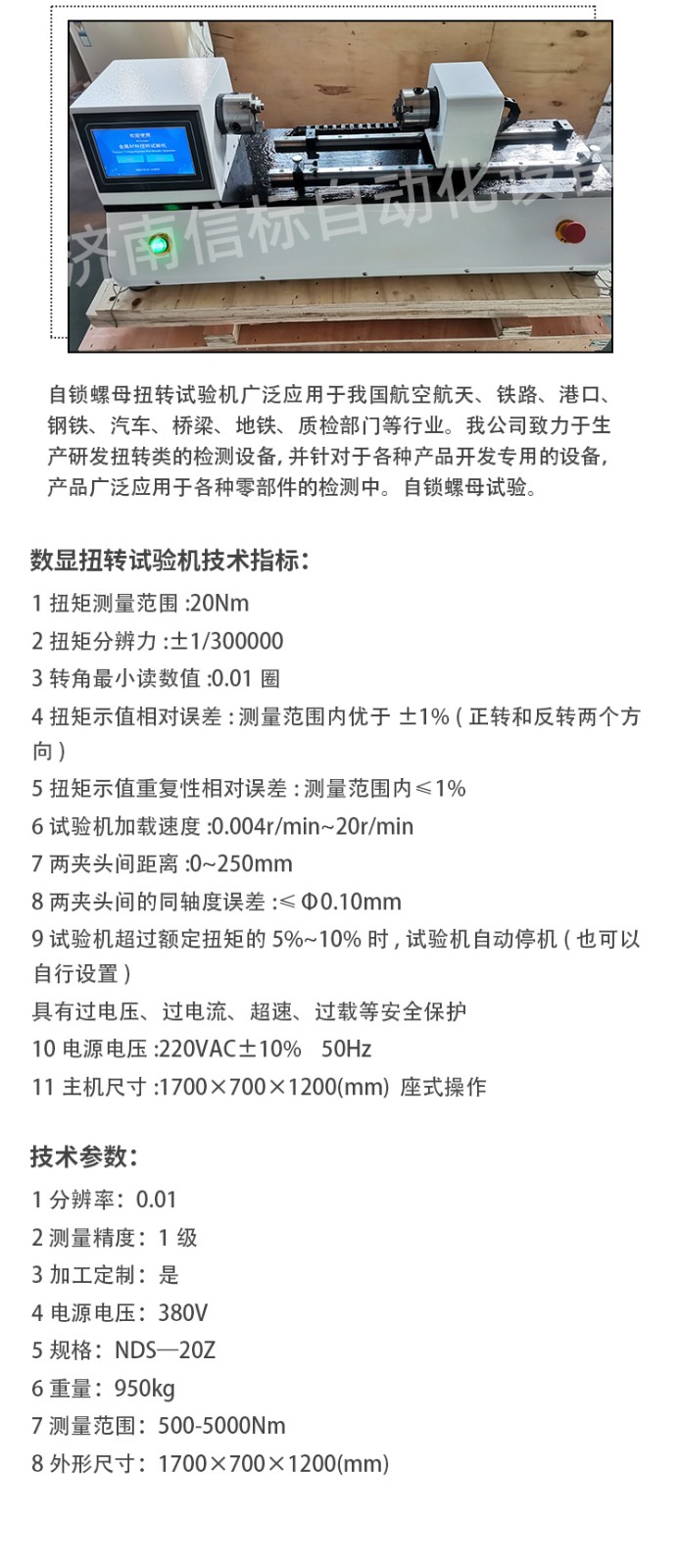 數(shù)顯扭轉(zhuǎn)試驗機技術(shù)指標(biāo): 1 扭矩測量范圍:20Nm 2 扭矩分辨力:±1/300000 3 轉(zhuǎn)角最小讀數(shù)值:0.01圈 4 扭矩示值相對誤差:測量范圍內(nèi)優(yōu)于±1% (正轉(zhuǎn)和反轉(zhuǎn)兩個方向) 5 扭矩示值重復(fù)性相對誤差:測量范圍內(nèi)≤1% 6 試驗機加載速度:0.004r/min~20r/min 7 兩夾頭間距離:0~250mm 8 兩夾頭間的同軸度誤差:≤Φ0.10mm 9 試驗機超過額定扭矩的5%~10%時,試驗機自動停機(也可以自行設(shè)置) 具有過電壓、過電流、超速、過載等安全保護 10 電源電壓:220VAC±10%    50Hz 11 主機尺寸:1700×700×1200(mm)  座式操作 功能特點: 1、適用于WINDOWS平臺的中文試驗軟件,實現(xiàn)試驗數(shù)據(jù)采集處理。 2、可實時采集試驗數(shù)據(jù)、運算處理、實時顯示并打印結(jié)果報告。 3、曲線遍歷:可用鼠標(biāo)對曲線數(shù)據(jù)逐點訪問,以便求取各種數(shù)據(jù)。扭矩與扭角關(guān)系曲線中能反映任意點扭矩—角度的關(guān)系,能方便地在曲線上找到所求數(shù)據(jù)點;可方便地對曲線局部放大還原等。 4、根據(jù)需要可隨時對扭矩、角度測量通道進行手動或自動清零。 5、自動存盤:試驗條件、試驗數(shù)據(jù)自動存盤,需要時可隨時調(diào)出。 6、批量試驗:試驗條件設(shè)定后,可依次完成一批樣品的試驗,試驗條件、試樣參數(shù)、測試數(shù)據(jù)、結(jié)果可存儲,隨時調(diào)用,再次試驗無須設(shè)置。 7、打印試驗報表。