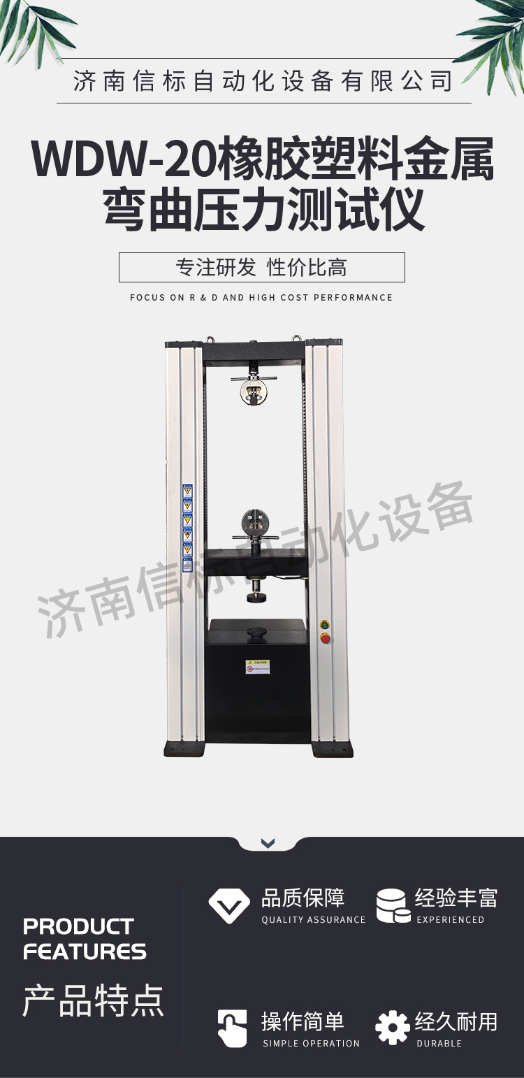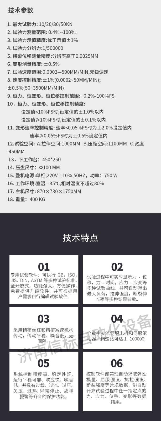該試驗機(jī)適用于金屬、非金屬材料的拉伸、壓縮、彎曲、剪切、剝離、撕裂等多種試驗,如:橡膠、塑料、電線電纜、復(fù)合材料、塑料異型材、金屬棒材、板材、彈簧、構(gòu)件等。可執(zhí)行GB,ISO,JIS,DIN,ASTM等多種試驗標(biāo)準(zhǔn),并可根據(jù)用戶需求編輯試驗軟件。是質(zhì)檢單位、科研部門、大專院校、工礦企業(yè)必備的檢測儀器。 二、測量參數(shù): 1. 最大試驗力: 10/20/30/50kN  2. 試驗力測量范圍: 0.4%--100%。 3. 試驗力示值精度:優(yōu)于示值±1% 4. 試驗力分辨力:1/500000 5. 橫梁位移測量精度:分辨率高于0.0025mm 6. 變形測量精度: ±0.5% 7. 試驗速度范圍:0.0002—500mm/min,無級調(diào)速 8. 速度控制精度:±1%(0.0002~50mm/min); ±0.5%(50~3500mm/min) 9. 恒力、恒變形、恒位移控制范圍:   0.2%-100%FS 10.恒力、恒變形、恒位移控制精度:                設(shè)定值<10%FS時,設(shè)定值的±1.0%以內(nèi)              設(shè)定值≥10%FS時,設(shè)定值的±0.1%以內(nèi) 11. 變形速率控制精度: 速率<0.05%FS時為±2.0%設(shè)定值內(nèi)                      速率≥0.05%FS時為±0.5%設(shè)定值內(nèi) 12.試驗空間:  A.拉伸空間:1000mm   B.壓縮空間:1100mm   C.寬度:450mm  13.下工作臺:450*250       14. 壓盤尺寸:φ100 mm 15. 整機(jī)電源:單相,220V±10%,50Hz,功率:750 W 16. 工作環(huán)境:室溫—35℃,相對濕度不超過80% 17. 主機(jī)尺寸: 870×730×1750mm 18. 重量:400 kg 三、產(chǎn)品配置: 1、主機(jī)                                               一套 2、松下A7全數(shù)字伺服電機(jī)及伺服驅(qū)動器;                一套 3、高精度負(fù)荷傳感器; 5kn/1kn/500N/200/               各一支 4、Hiwin精密滾珠絲杠;                                     2支 5、光電編碼器(2500線,內(nèi)置);                             1支 6、夾具:滿足海綿/汽車座椅所需工裝                        1套(有多種)
